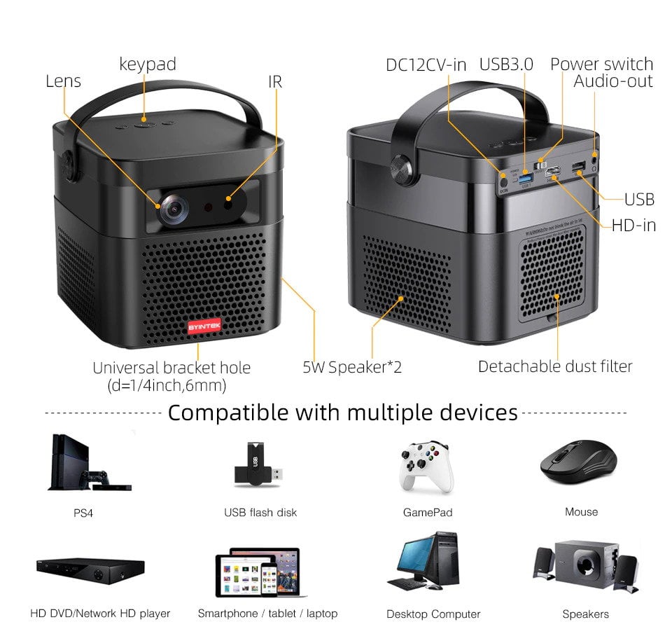 بروجكتر باينتك سنيمائي محمول (مستعمل) Byintek Smart 3D DLP Projector UFO U70 Pro و بمقاس عرض 180 إنش (used)
