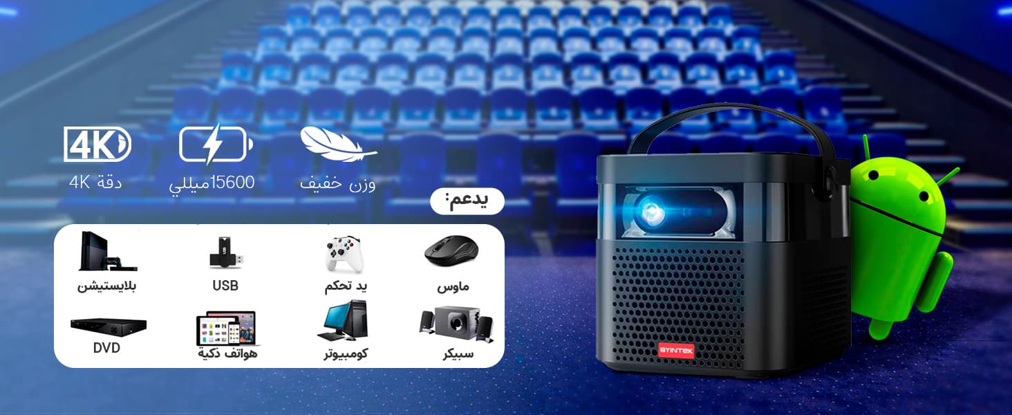 بروجكتر سنيمائي محمول بدقة Byintek Smart 3D DLP Projector UFO U70 Pro بمقاس عرض 180 إنش ، يتميز بالجودة العالية وخفة الوزن وسهولة الحمل، ويمنحك عرض ورؤية واضحة بدقة بتصميمه الأنيق و الحديث سيعطيك تجربة سينمائية رائعة في المنزل وليمكنك من مشاهدة الأفلام والاستمتاع بالحفلات.