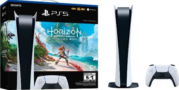 قم بقضاء وقت ممتع مع الأصدقاء والعئلة مع بلايستيشن 5 من شركة سوني Sony.سوني 5 بنسختها الرقمية والإصدار العالمي تأتي مع لعبة Horizon Forbidden West وهي لعبة أكشن ومغامرة وأيضاً عالم مفتوح.