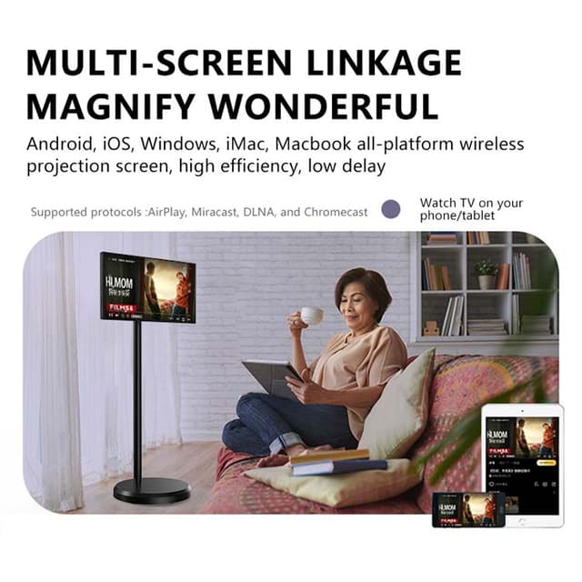 - شاشة متنقلة مزود بقاعدة متحركة تدعم ضبط الدوران بزاوية 90 درجة، مما يتيح لك وضع الجهاز بزوايا مختلفة.