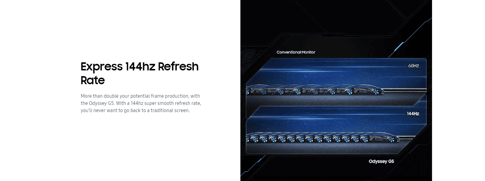 إحصل على الاداء المطلوب أثناء اللعب أو متابعة الأفلام وغيرها مع شاشة مونيتور منحني Samsung G5 Odyssey Curved Monitor شاشة العاب منحنيه بدقة اكبر مع إنحناء مميز لواقعية أكبر، بالإضافة لمعدل تحديث ووقت تأخير مناسبين للألعاب.
