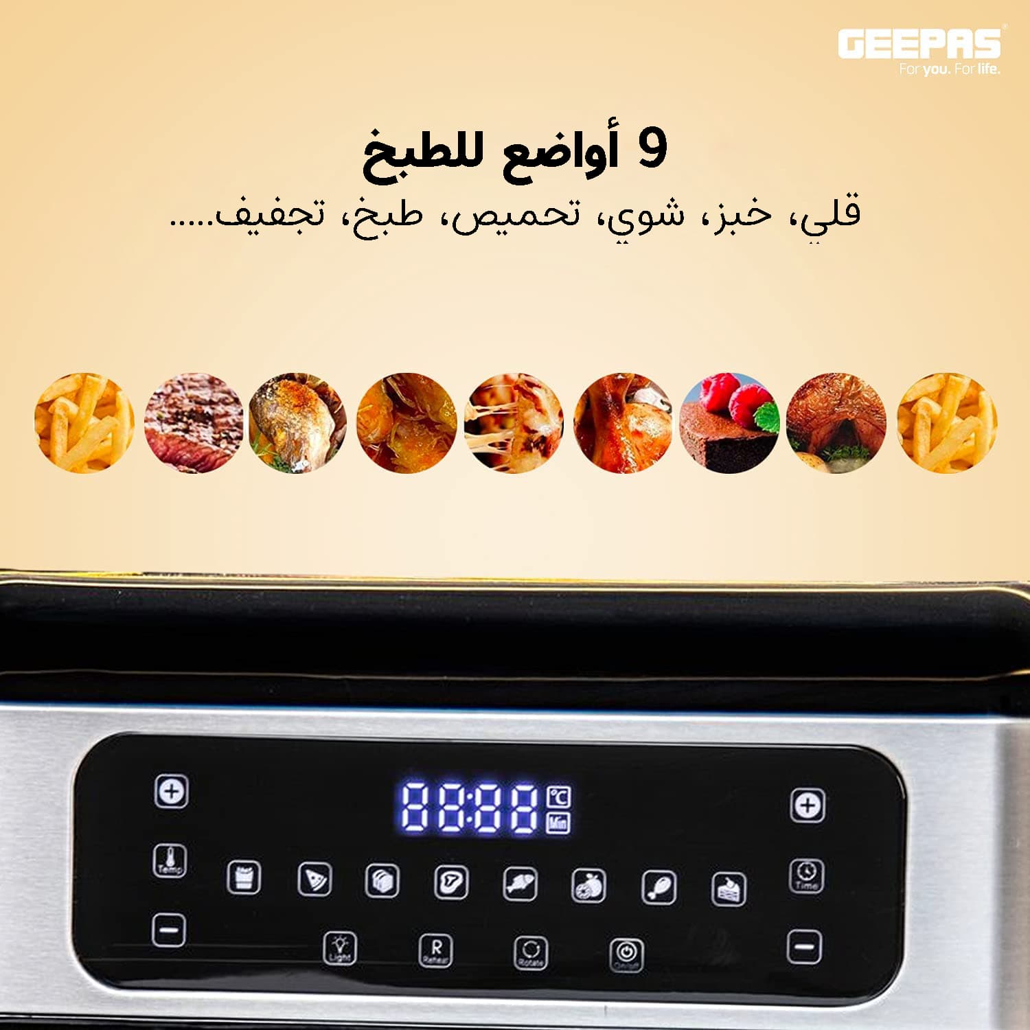 - يمكن بواسطة فرن كهربائي جيباس الطبخ بميزة الدوران بزاوية 360 درجة للتأكد من إستواء الطعام بشكل متناسب