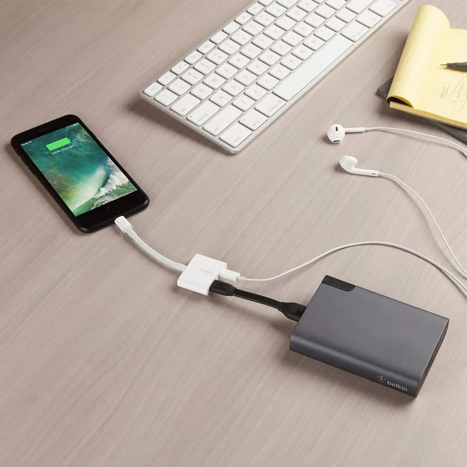 وصلة شاحن وسماعه بيلكن Belkin Rockstar Lightning Audio + Charge Adapter ، يشمل منفذين Lightning لتتمكن من استماع الموسيقى والشحن معاً مع المحول المثالي والمصنوع من مواد أصلية والتي يدوم طويلاً.