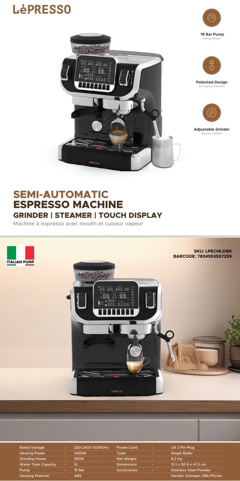 مميزات ماكينة قهوة اسبريسو منزلية ليبريسو 19 بار مع مطحنة قهوة مدمجة 1450 واط Lepresso Espresso Coffee Maker With Bean Grinder: