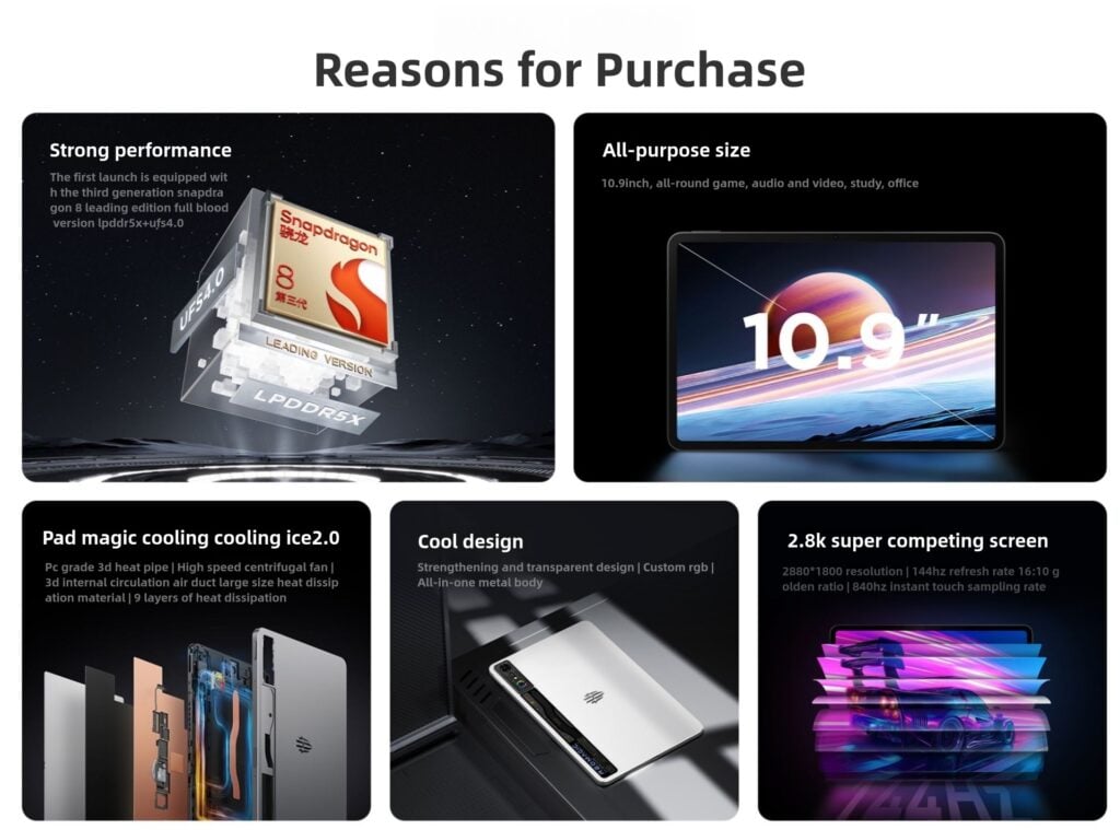تم تجهيز ايباد ريد ماجيك بشريحة سناب دراغون 8 من الجيل الثالث كونه جهازا للألعاب، يأتي مع مروحة تبريد مدمجة تقلل من درجة حرارة الجهاز أثناء جلسات اللعب المكثفة. بالإضافة إلى أنه يساعد على تقليل درجة حرارة الجهاز أثناء اللعب المكثف ويحافظ على أداء مستقر وثابت.