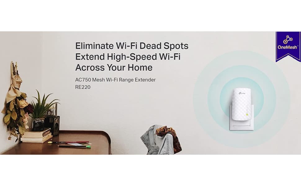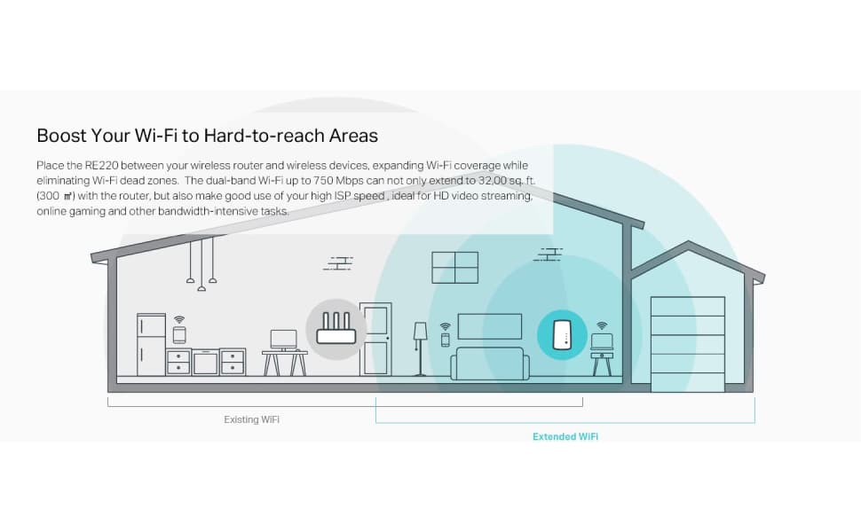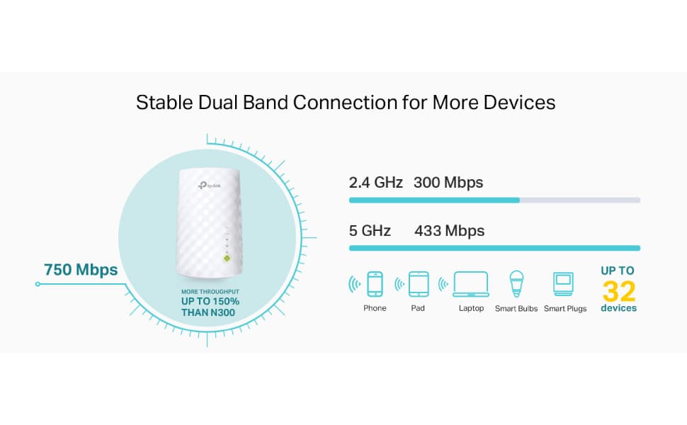 - Dual-band range extender that supports internet speeds of up to 750 Mbps