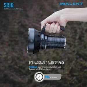 SR16 is powered by a custom battery pack with 4 built-in rechargeable 21700 lithium-ion batteries, the same custom battery pack used in MS12 mini and MR90, which can be fully charged in 2 hours and will provide SR16 with up to 98 hours of runtime with each charge, making it the best long-range handheld flashlight.Features of Imalent SR16 Rechargeable Handheld Flashlight 55000 lumen flashlight: