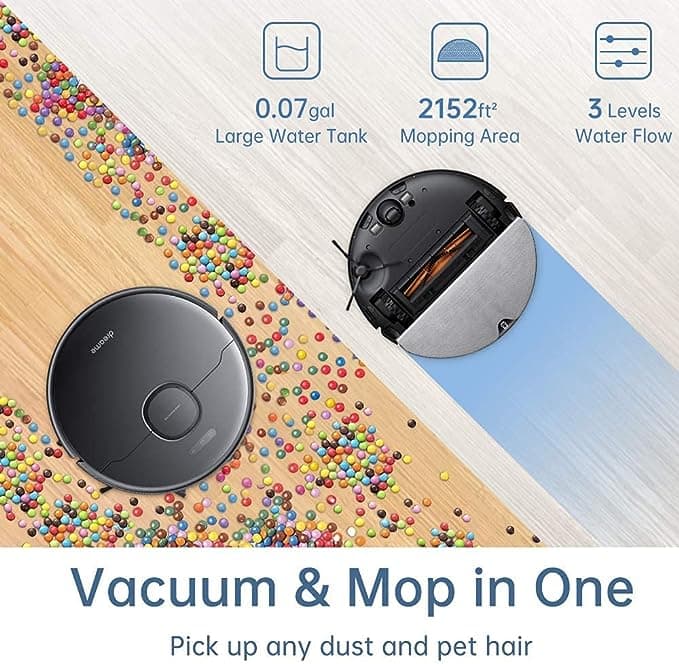 It comes with a 570ml dust tank and a 270ml water tank. It can clean and mop at the same time. After full charging, it can clean an area of up to 2690 square feet and mop 2152 square feet.Enhanced Safety Features in Robot Vacuum