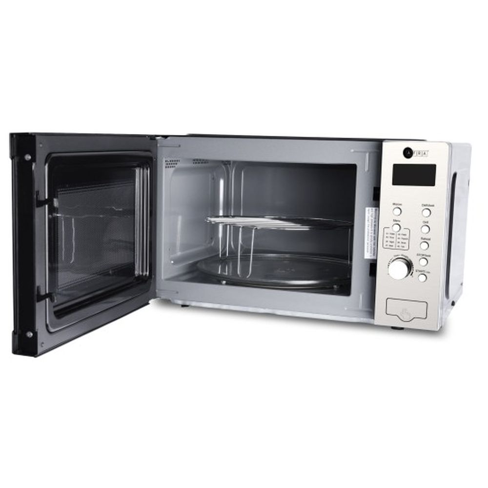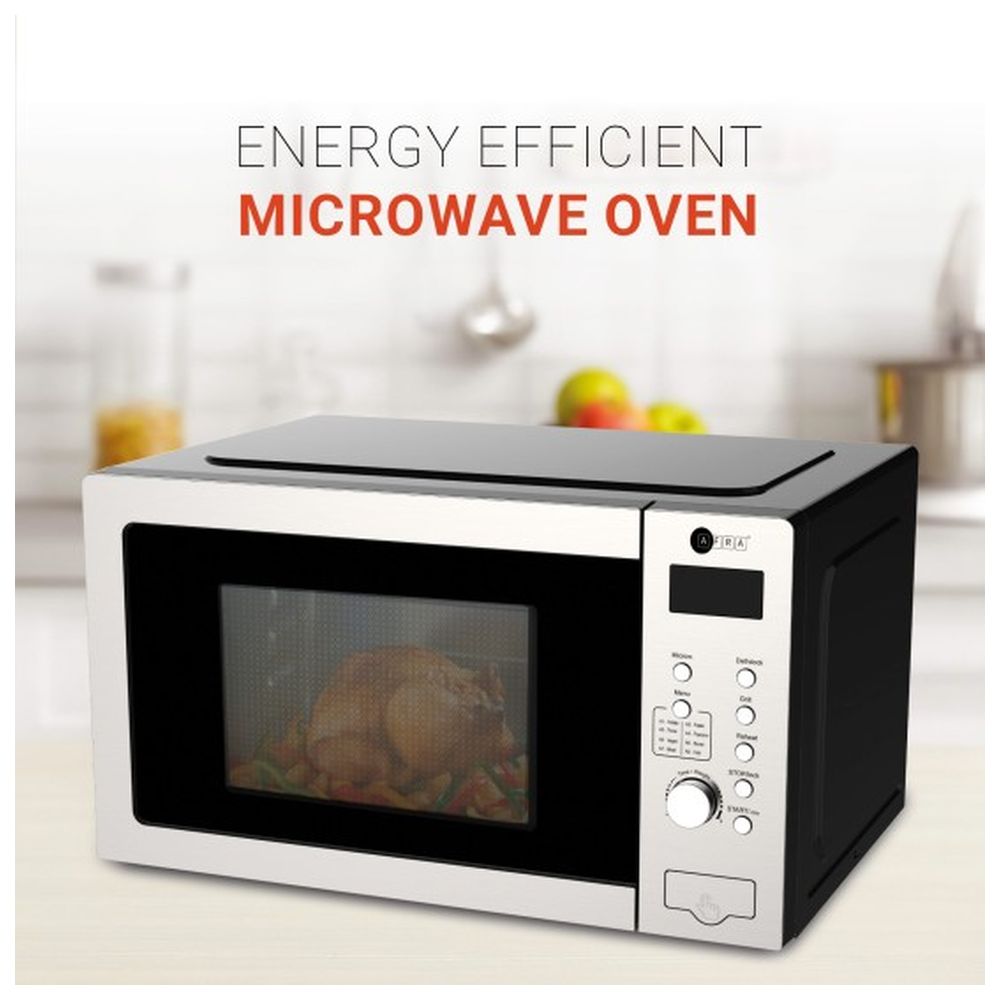 The Afra Japan 30L Microwave Oven is a Japanese-designed kitchen appliance featuring 1200 watts of power and a 30-liter capacity. It comes equipped with a digital control panel that provides easy access to multiple cooking options and settings.