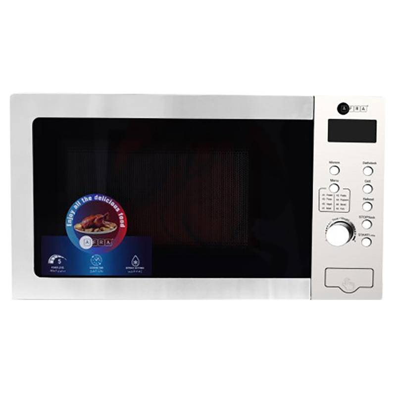 Japanese design microwave with 1200 watts power and 30-liter capacity digital control panel from Afra company. The microwave features a perfect Japanese design and easy-to-use control panel, offering many options including child lock for high protection and quick automatic cooking for easy and fast food preparation.