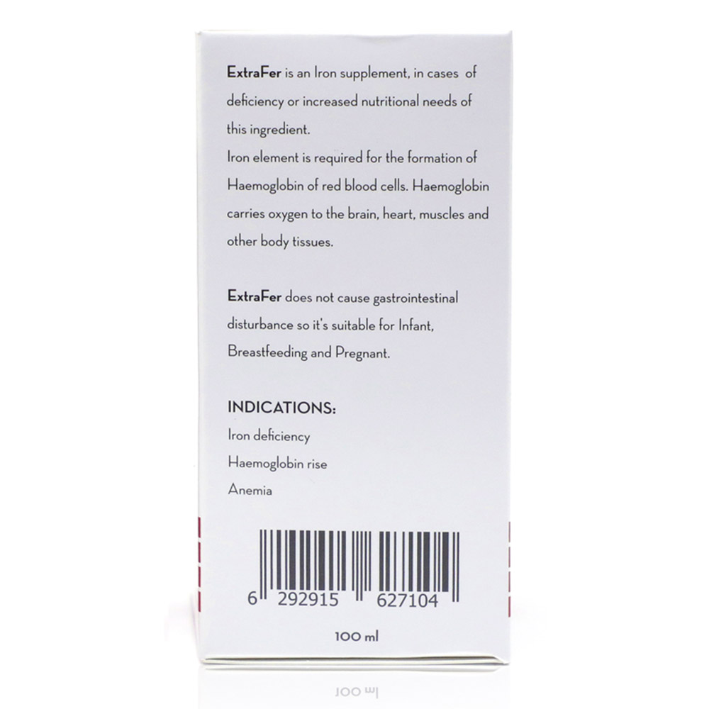 Extrafer Liquid is a liquid dietary supplement formulated with iron and Vitamin C. Iron is an essential mineral responsible for producing hemoglobin, which carries oxygen in the blood to all body cells. This supplement plays a vital role in energy production, immune system support, and brain function enhancement.
