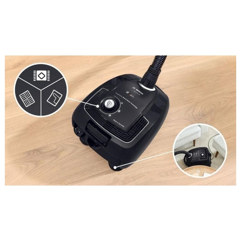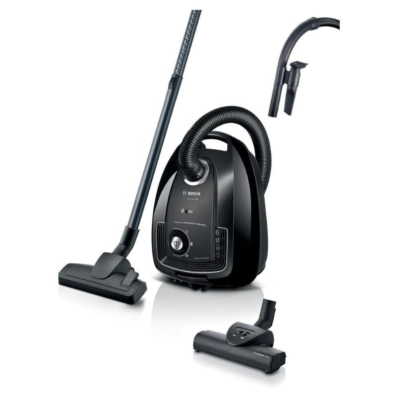 To clean your home easily and efficiently, the Bosch Series 4 Bagged Vacuum Cleaner in sleek black design offers high suction power for effective cleaning of floors and carpets. It features a large dust collection bag that reduces the need for frequent emptying and a practical design that makes it easy to maneuver around the house for a comfortable and reliable cleaning experience.