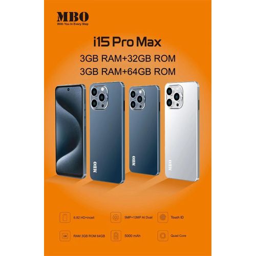 The MBO I15 Pro Max 3G is a smartphone designed to deliver a smooth everyday mobile experience at an affordable price. Featuring a large 6.82-inch HD+ display, 64GB of internal storage, a 13MP rear camera, and a long-lasting 5000mAh battery, this device balances style with substance in a sleek matte black finish.