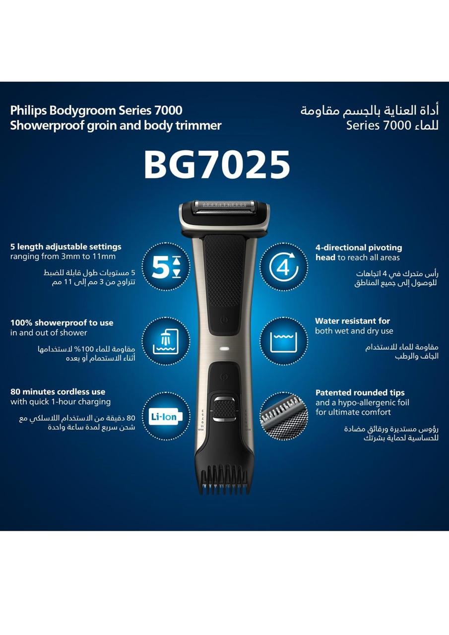 The Philips Bodygroom Series 7000 (Model BG7025) is a versatile body grooming device designed for comprehensive body hair management. This showerproof trimmer combines advanced grooming technology with user-friendly features to deliver a comfortable and safe grooming experience across all body areas, including sensitive regions like the groin and armpits.