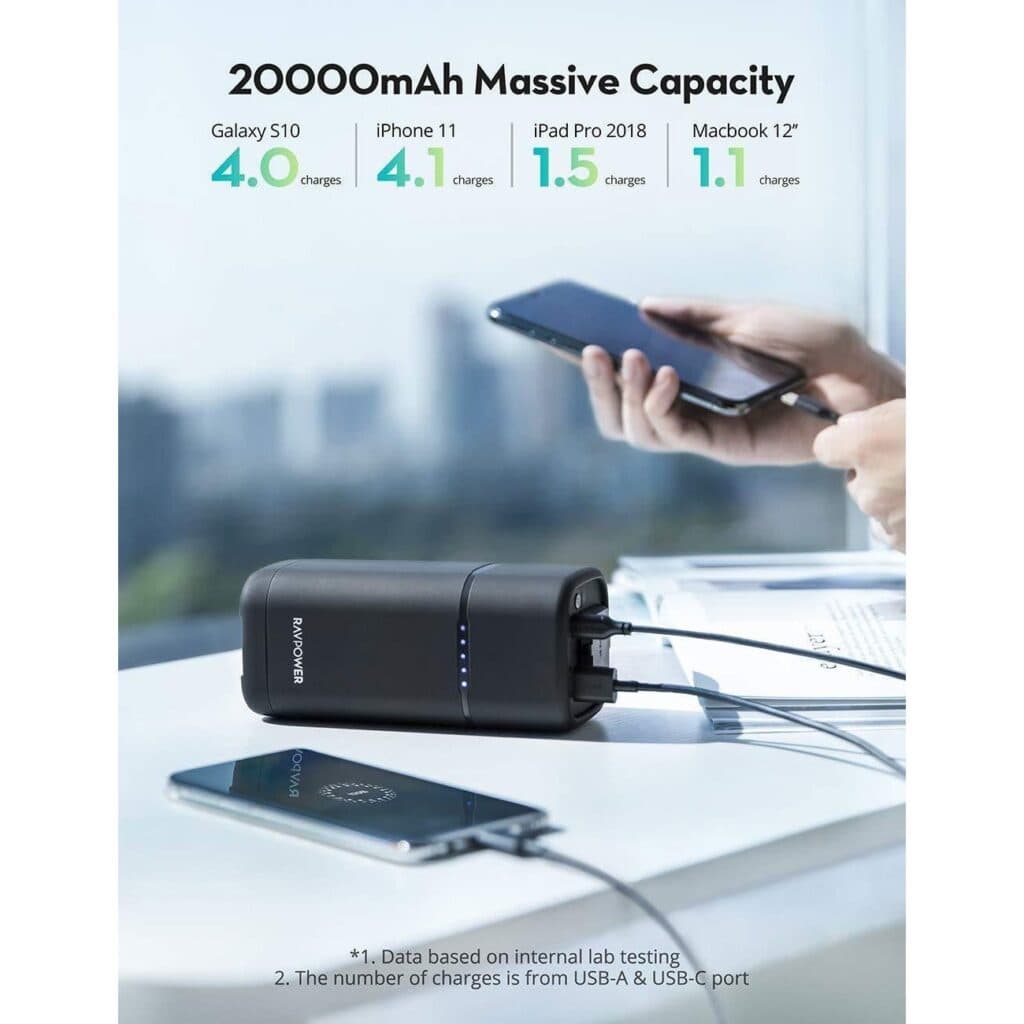 RAVPower PD Pioneer AC Portable Charger & Power Bank is a powerful and reliable portable charger. It stands out with its amazing ability to charge devices quickly. It provides fast charging for USB-C devices, such as MacBook, with its 30W PD port, and efficient charging for USB-A devices with its Quick Charge 3.0 port. With an 80W capacity, it can charge a wide range of devices, including GoPro cameras. It has a 20000mAh capacity and is an ideal solution for daily use due to its compact size.